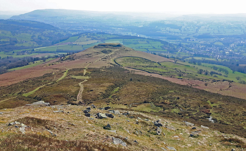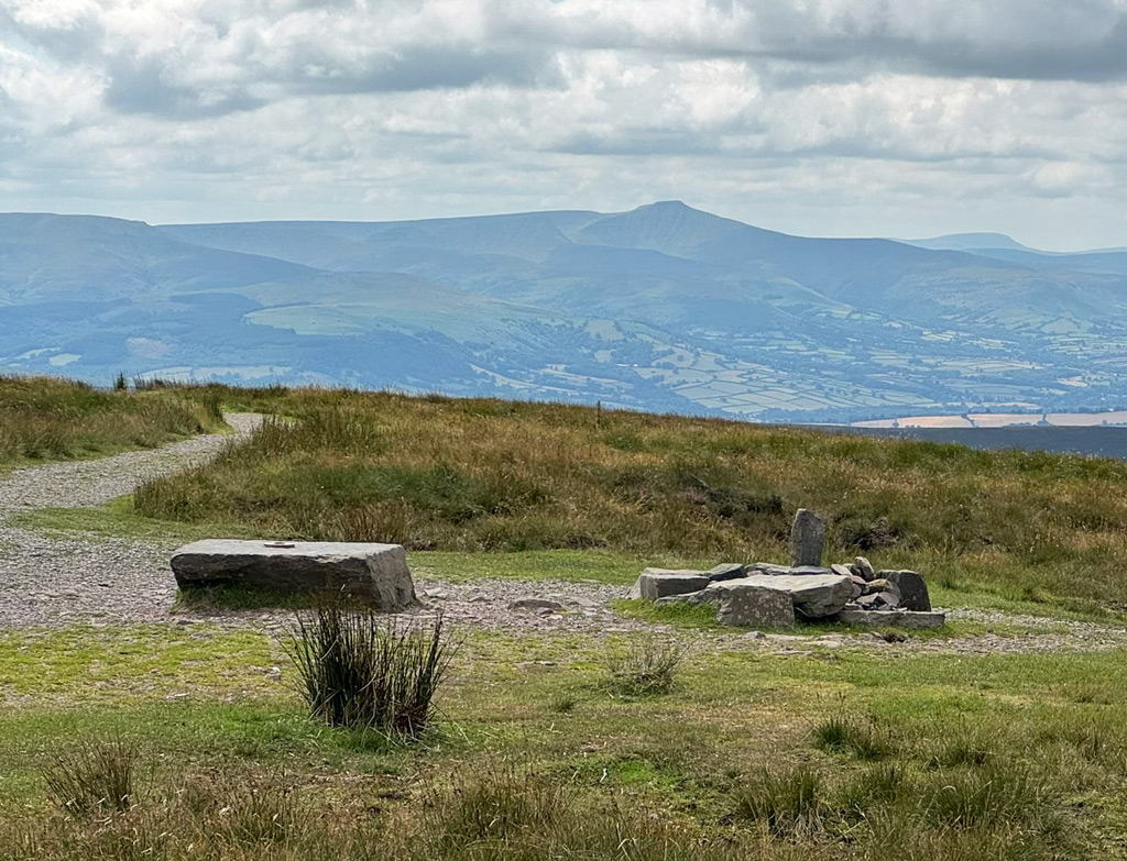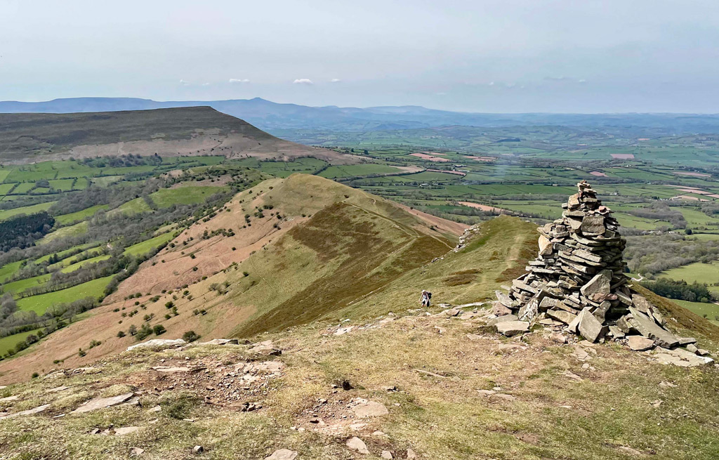 Crug Hywel is the Welsh name for Crickhowell, a splendidly historic little town at the foot of the Black Mountains, but it is also the name of a natural spur on Pen Cerrig-calch, whose slopes were sharpened to provide defence as an Iron Age hillfort standing at 1500ft above sea level. It’s also known, descriptively, as Table Mountain and provides a thrilling stepping stone to explore on the ascent to the first summit of Pen Cerrig-calch at 2302ft (701m), itself boasting even older constructions in the form of two sprawling Bronze Age cairns, along with a twentieth century OS trig pillar.