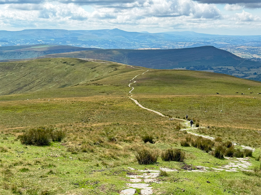 It’s an easy stroll along to the next peak, Pen Allt-mawr, which gives its name to this ridge, the Allt Mawr, running up to Waun Fach. Once again, piles of stones along the route denote ancient cairns, possibly burial mounds, as this high land was thought to have provided temporary habitation for summer grazing in the Bronze Age period.