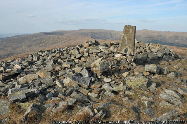 The summit of Pen Allt-mawr at 2361ft (711m) is the highest point of the ridge until Waun Fach is reached and also features an OS trig pillar, which became detached from its base over time and was listing badly for many years until it finally toppled in 2021. The trig was subsequently re-erected, although it is still not set into any foundations.