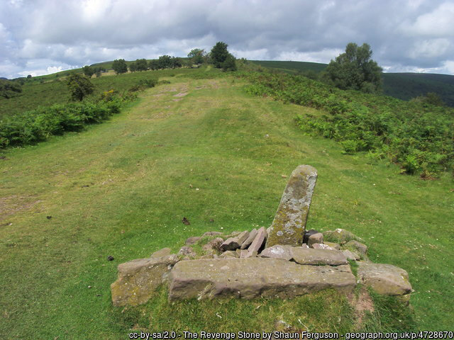 The Gader Ridge forms one half of a Waun Fach horseshoe walk, involving a seventeen-mile loop from Llanbedr. From Pen y Gadair Fawr, that route descends gradually to meet the Mynydd Du forest, cloaking the sheltered eastern slopes and comprising the highest tree-line in Wales, up to 700m. At the southern corner of the plantation, just as the ground begins to rise to the low hill of Crug Mawr, is the Dysgwlfa cairn, which by now will be clearly recognised as another round barrow. Close by are curious boundary marker stones, erected by the local estates. There are numerous boundary stones on neighbouring hills dating from around two hundred years ago.