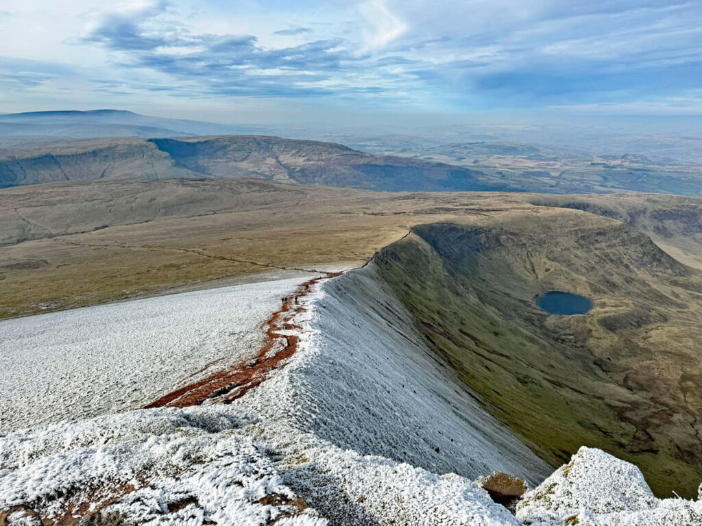 The ridge of Cefn Cwm Llwch is a magnificent ascent that boldly leads directly to the summit cairn of Pen y Fan. The final part is quite steep although without difficulty except when icy. The top section does look rather unlikely when chosen for descent, something much compounded in mist. For these reasons, there is a path of avoidance, traversing across from the shallow col between Pen y Fan and Corn Du that links to the ridge below the steep section.
