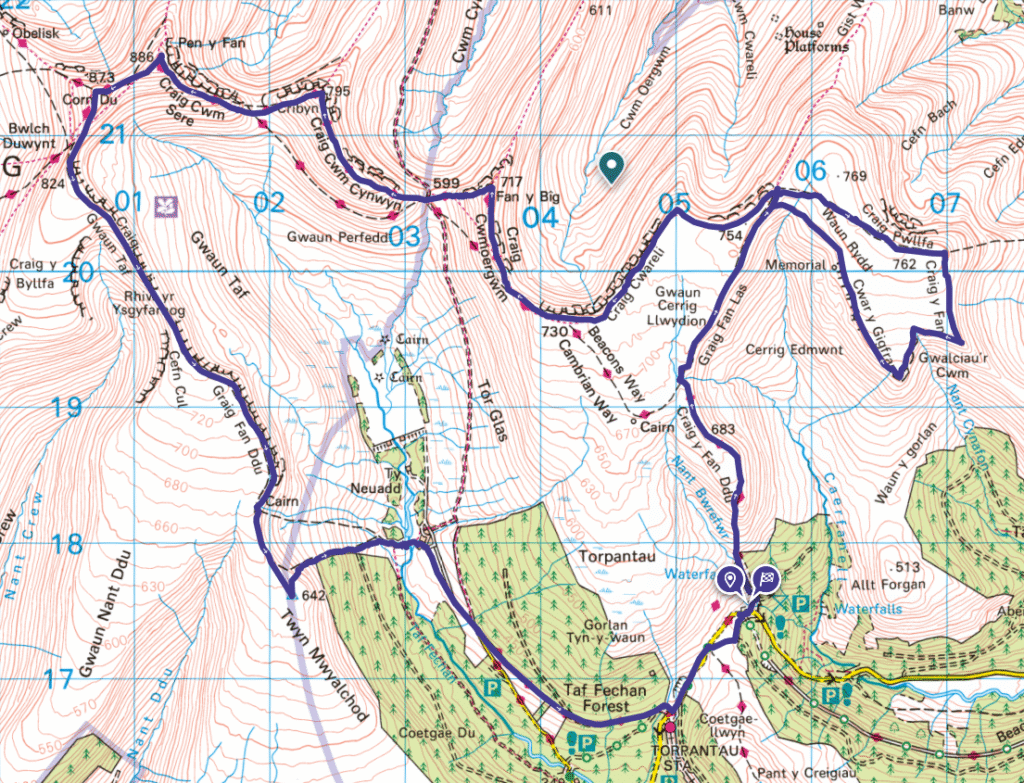 By utilising tracks through the Taf Fechan Forest to the minor road at Torpantau, the circuit can be linked to Blaen y Glyn Forest. In this case the route is recommended anticlockwise to best enjoy the breathtaking escarpment approach from Bwlch y Ddwyallt. A round of Waun Rydd is an additional option for those determined to bag every major summit. Enroute you will encounter wreckage of a Wellington Bomber and a memorial cairn commemorating the five Canadian airmen who failed to clear the Waun Rydd plateau in the mist in July 1942.