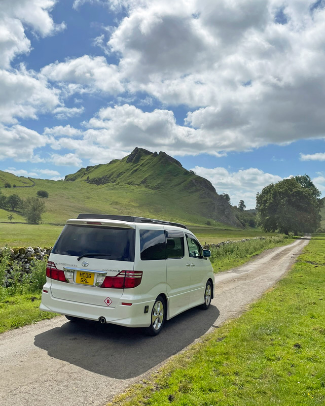 Looking down the western ridge of Parkhouse Hill to Chrome Hill. A single-track road divides the hills