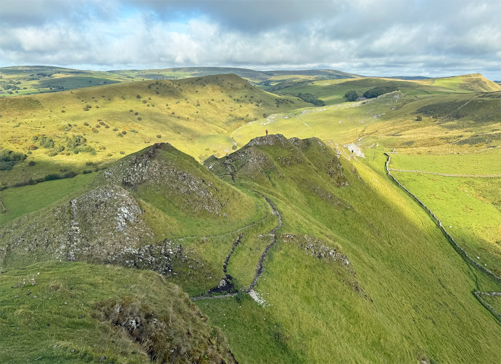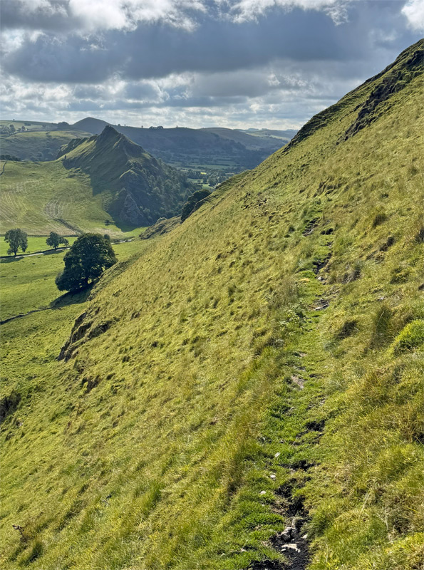 Parkhouse Hill can be circumvented entirely by paths around both sides, as indeed can Chrome Hill, which opens up possibilities for an out and back traverse, without the extra circuitous walking. Regarding Chrome Hill, the path on the south side is less easy to follow and the north side path, whilst never a problem, does cross a steep grassy slope at one point, which again may be slightly disconcerting if wet.