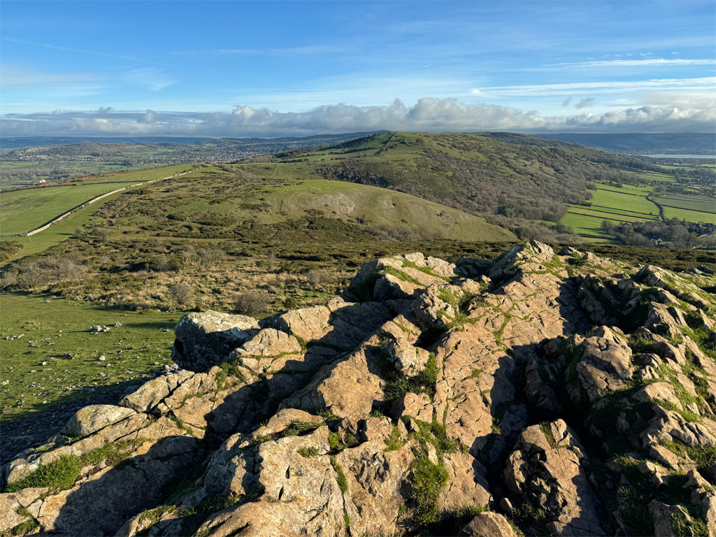 And so to the summit of Crook Peak at 627ft (191m), which may be lowly but who cares when it is this exhilarating. The top is so rocky that it doesn’t require a cairn and the strata slants down at a thirty degree angle, forming an abrupt escarpment that provides a flourish to the final ascent. The top is a glorious place to be and the views are even more extensive than on Wavering Down. Unsurprisingly the hill once once used for beacon fires, as far back as the 1500’s to warn of invasion by the Spanish Armada. From here the eye casts west across the Bristol Channel to South Wales, then turns to gaze beyond the isolated lump of Brent Knoll to the hills of Exmoor. Our lofty perch also grants a unique perspective of the steady bustle on the M5 motorway.