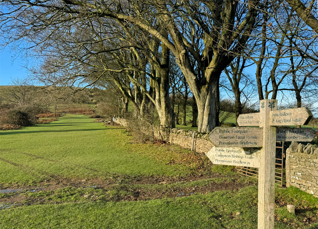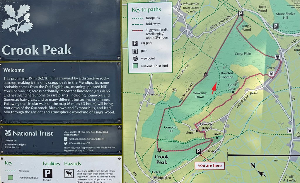 For those beginning at Webbington Road, I would suggest taking an anti-clockwise circuit, as interest will mount with each progressive step. Start by rounding the southeast ridge of Crook Peak and wandering through Compton Bishop village, then cross the fields and take the slanting path up through woodland (muddy when wet so in such conditions better going up), before emerging into open country.