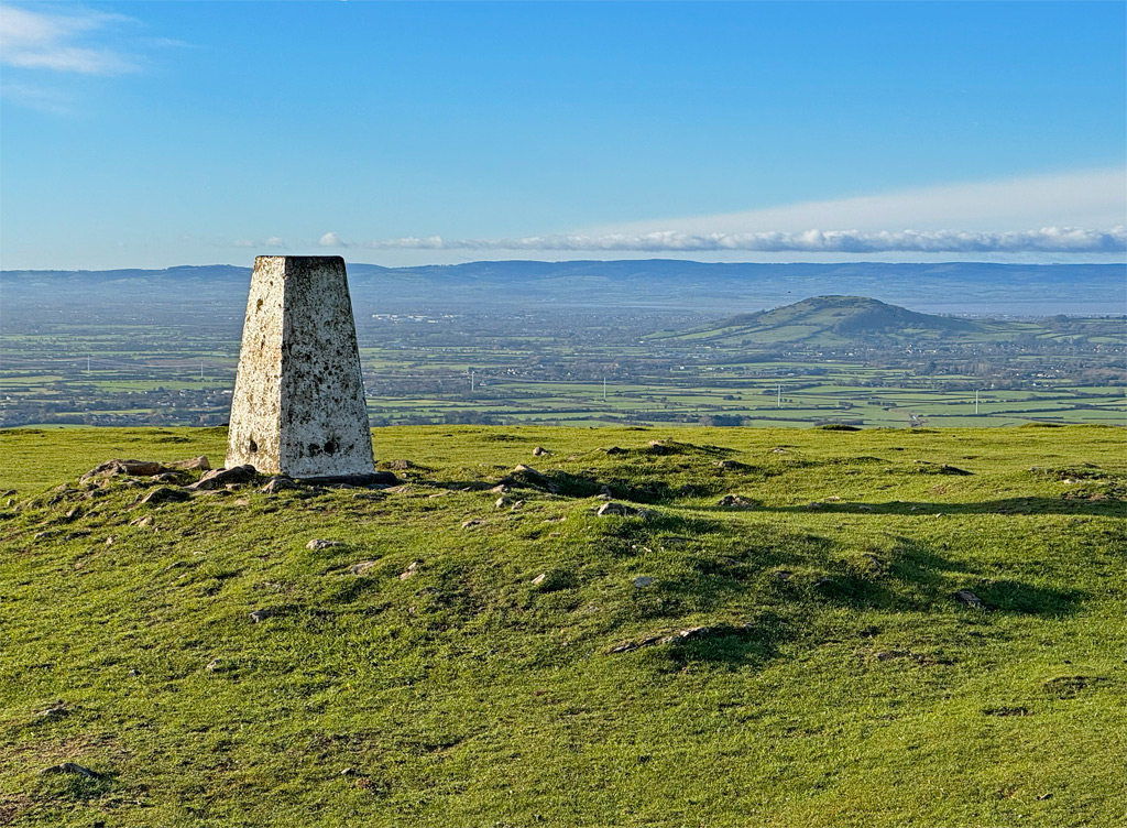 On reaching the ridge at the appropriately named Hill Farm, the path from King’s wood is joined (pictured above). A pleasant short stroll leads to the summit of Wavering Down at 692ft (211m), which is relatively flat with a trig pillar at the eastern end. It can be busy, as the out and back from King’s Wood is a popular walk and particularly rewarding, supplying great views for little effort for the local population of this part of Somerset (interestingly there is no demonym for those born in Somerset as I could have saved space by just calling them Zummerzetties or whatever). The Mendip hills head off to the east, while turning south the scene is dominated by the Somerset Levels, guiding the eye to the Quantock Hills.