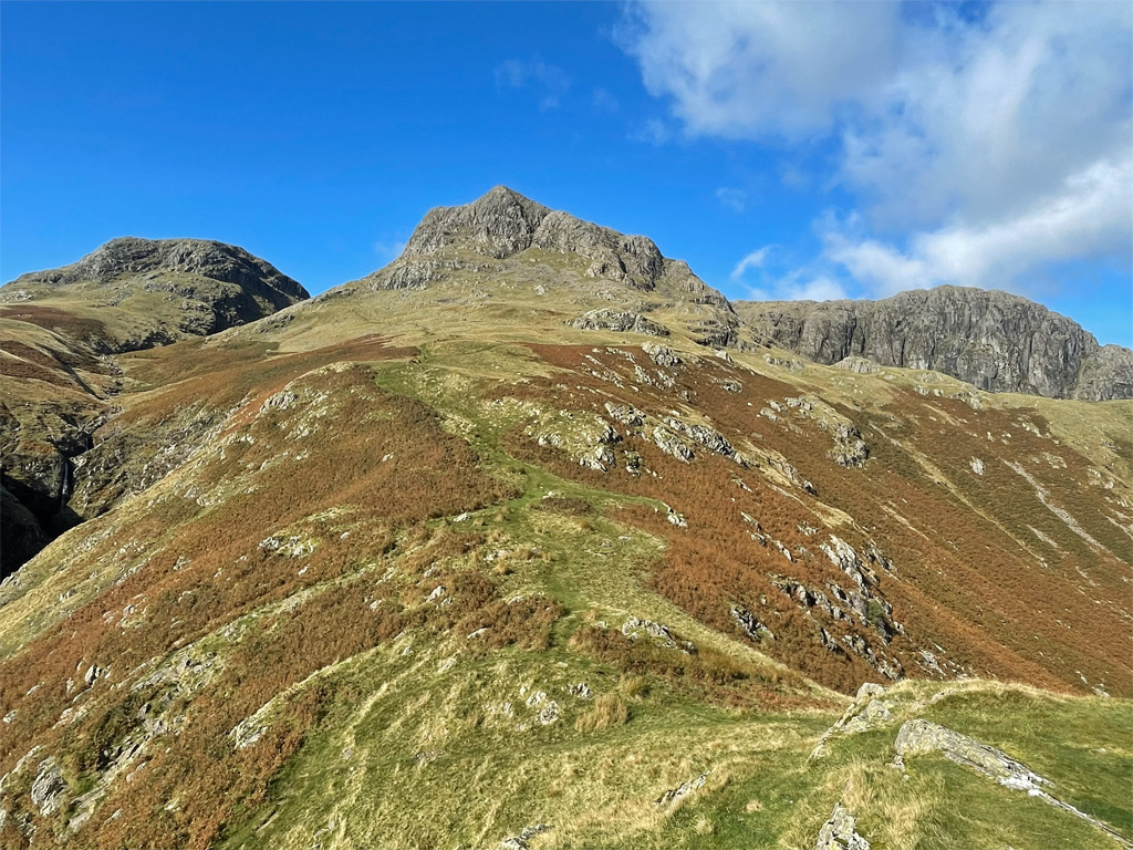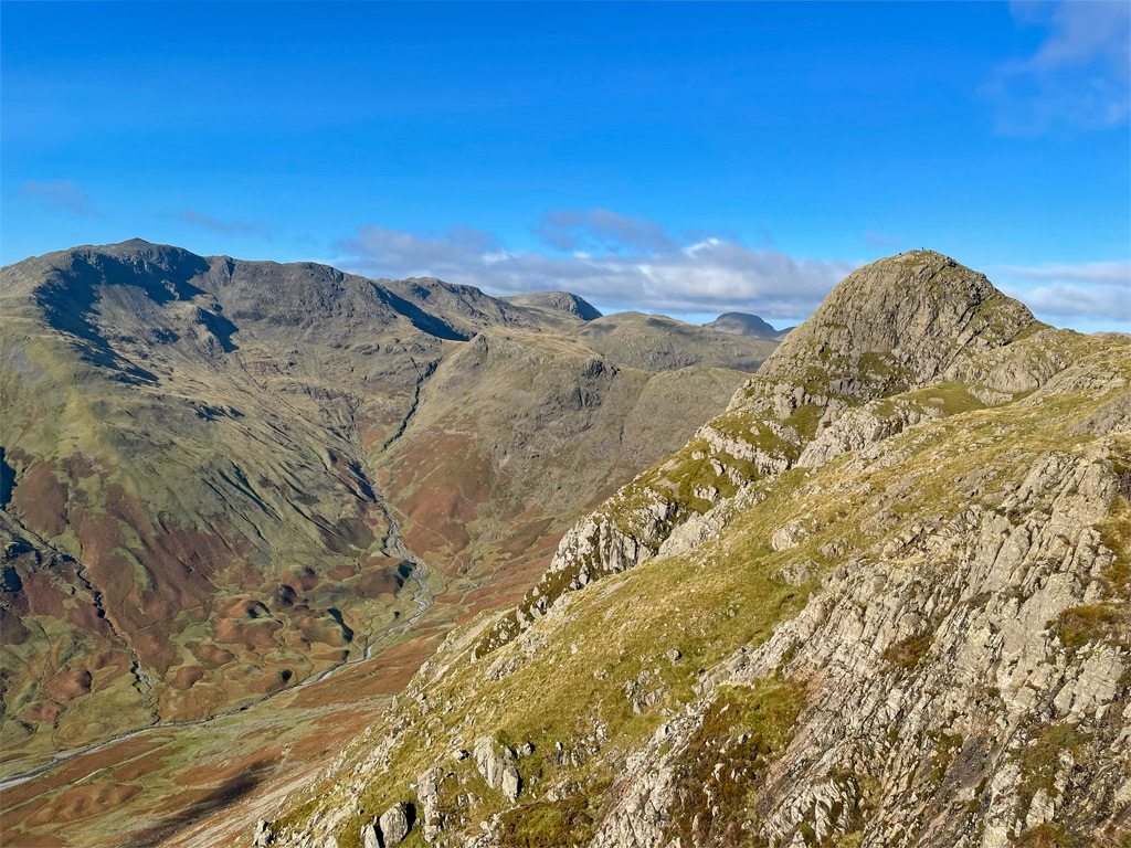 Whichever way the walker attains the summit eyrie will usually involve an easy scramble as befits the rocky nature of the top. This is a uplifting place to be, lording over the plunging canyon of Mickleden, while admiring the powerful presence of Bowfell above the head of the valley. Loft Crag blocks the lower Langdale valley, concentrating attention of the verticalities of Gimmer Crag.