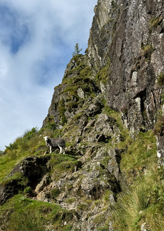 The top of Pavey Ark is a fine, rocky place, yet can’t avoid delivering a slight anticlimax, for there is no pointed peak, merely a gently rising plateau that drifts up to Thunacar Knott, the true summit of the hill. This aspect is not appreciated when ogling the iconic view from afar. One might think of Pavey Ark as the Lake District’s version of a climb to Conan Doyle’s Lost World, complete with cute Herdwick dinosaurs!