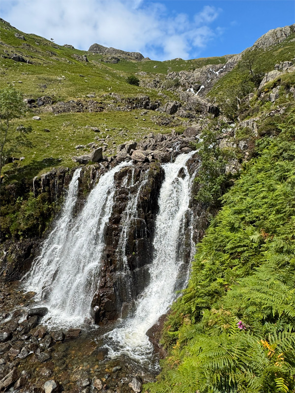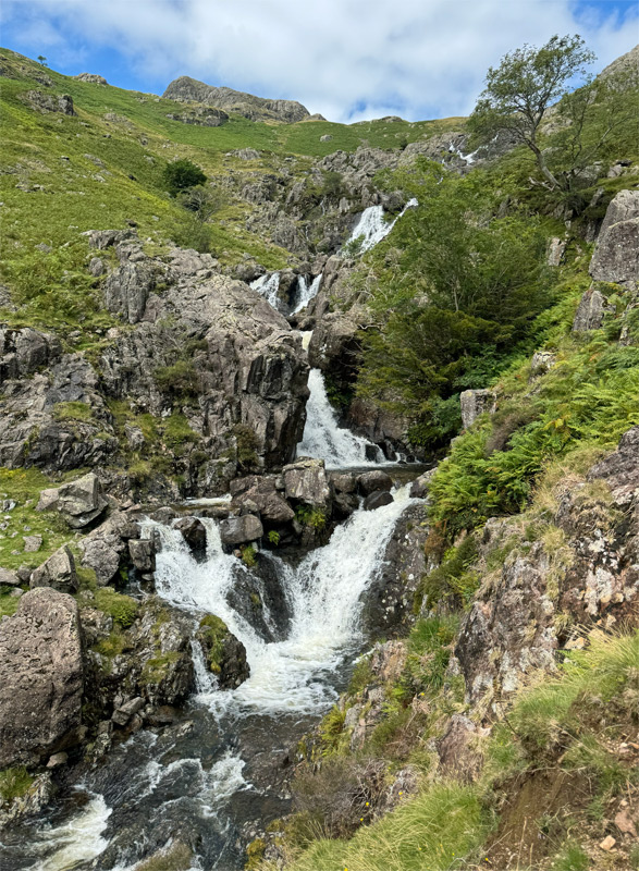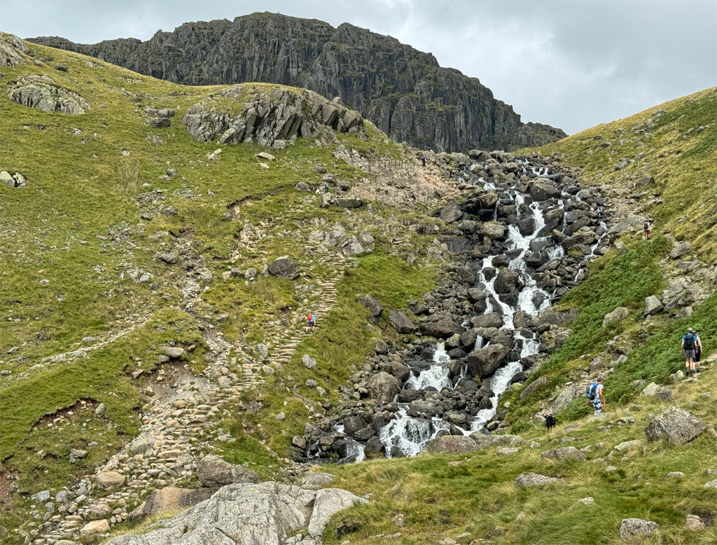 Waterfalls were a favourite of the Victorians and Stickle Ghyll displays several fine cataracts, which add interest to relieve the steep ascent. The massively constructed path, a necessity due to the sheer volume of traffic, has several variations although the crowds generally adhere closely to the beck.