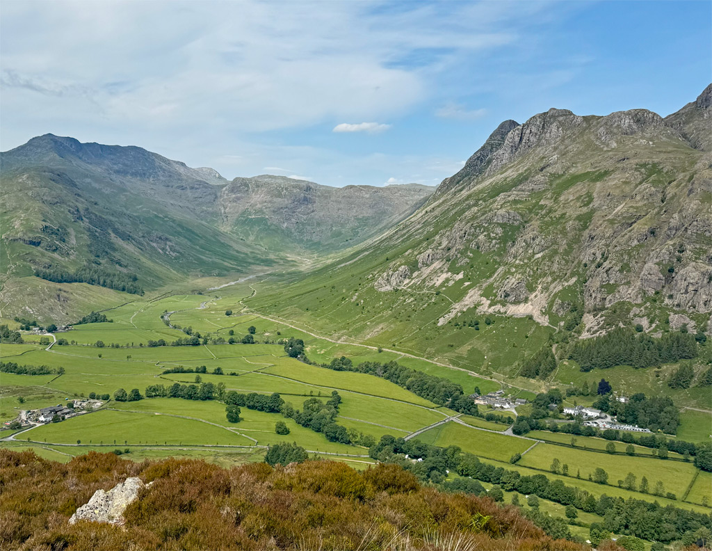 Looking down Mickleden, over the humpy lateral moraine, from the amphitheatre of Rossett Gill at its head. Whilst Mickleden perhaps equally belongs to Bowfell, the immediacy of Pike o’ Stickle looming above the walker weighs its affinity to the pikes