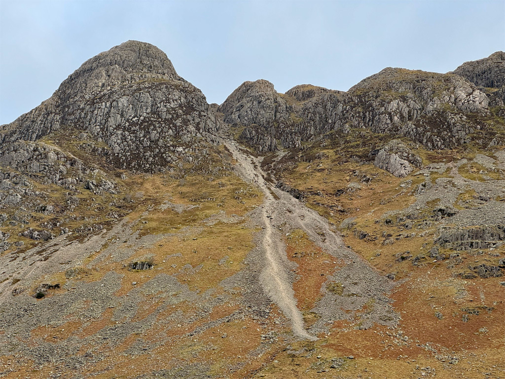 Unsightly scree debris pours from the rocky skyline of Pike o’ Stickle, described in the latest Fellranger guide as being in a dire state. Ascent or descent this way is no longer advised