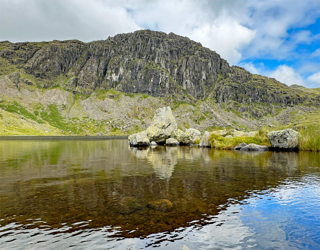 The imposing vision of Pavey Ark framing the sky above Stickle Tarn is unforgettable, the potency remaining powerful no matter how many times it is seen. Personally, I have always considered Pavey Ark to be one of the ‘pikes’ as its presence is integral to the overall, iconic picture. It’s a big crag too, the scale swollen by the apron of steep scree at it foot.